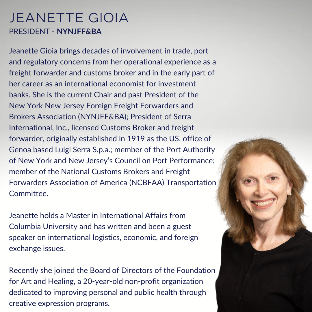 - Jeanette Gioia, President, New York / New Jersey Foreign Freight Forwarders & Brokers Association;